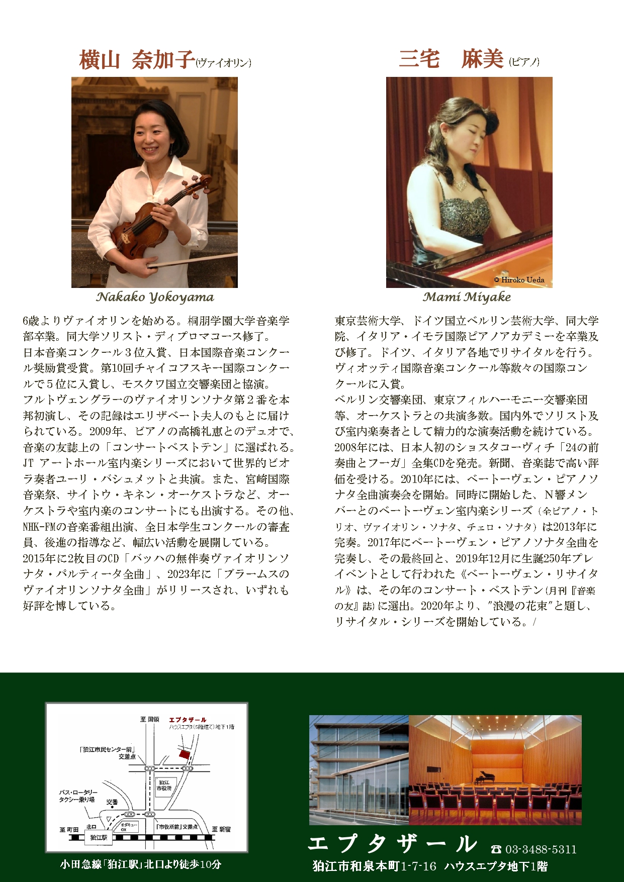 ♪横山 奈加子 ヴァイオリン・リサイタル ヨハネス・ブラームス ヴァイオリン・ソナタ 演奏会 |
